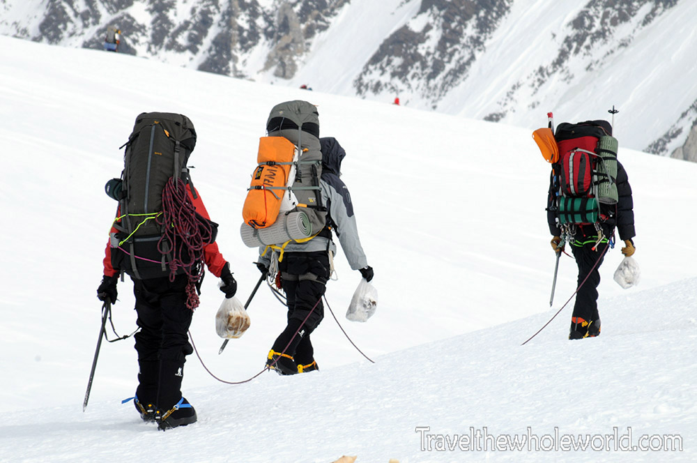 After the summit we returned to Camp IV and all crashed. On Day 23 we were only half way finished and still had to get off the mountain along with everything we brought. You’re excited enough that despite all the hard work you have to do to get home it’s not too difficult. Not all of it is enjoyable though, in the photo above people are seriously carrying their crap down from Camp IV.