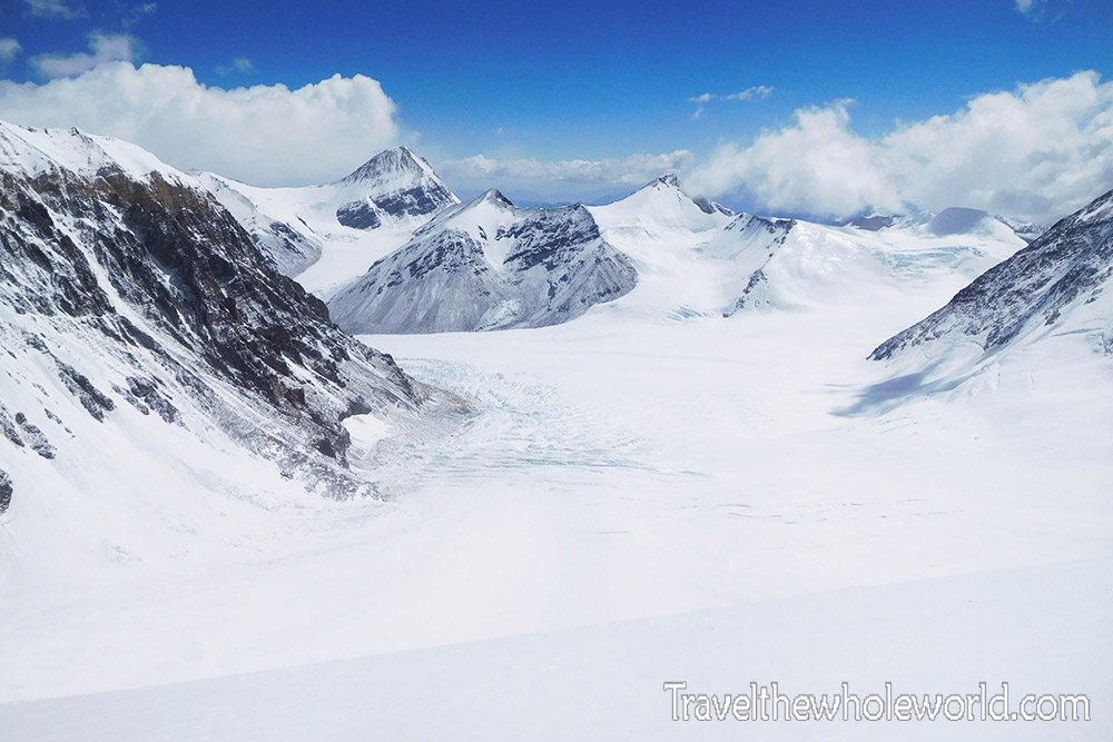 This next photo was taken from the top of the North Col after the climb was finished. I’m posting it now so you can see the flat snowfield you have to cross after leaving ABC to get to the bottom of the North Col. It’s hard to tell in the photo, but you can almost see ABC near the left center of the picture. From here there is about an hour hike through some rocky terrain, then another hour hike through the snowfield. The bottom of the North Col is at 22,000 feet (6,700 meters).