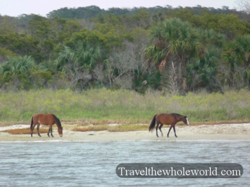 On the left are two wild horses that roam free on Cumberland Island. There are about 250 wild horses on the island and they can be found all over the island. Alligators, turkeys, and other animals also live here. On the right are some of the sand dunes meeting the forest close to the coast. Horses are most easily spotted along the beaches.