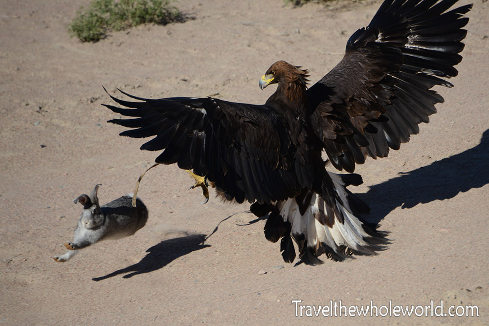 This eagle was only a year old so was relatively young and inexperienced. When he dived down from the sky the rabbit looked absolutely done for, but the rabbit actually escaped! To be honest I actually felt guilty once I saw the rabbit thrown out onto the ground for my own entertainment purposes, so his escape let me continue my trip without a guilty conscience. The hunters were able to capture the rabbit again and I told them he had earned his freedom. The agreed with me but still kept it, so I’m sure the eagle and the rabbit would meet again.