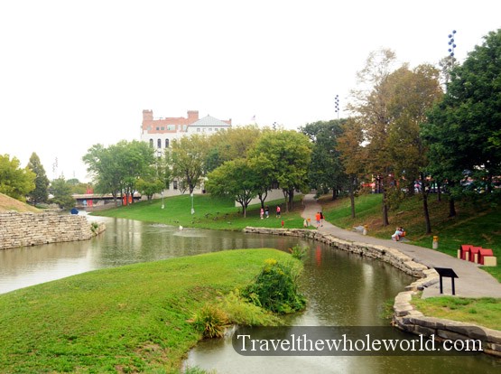 After Lincoln I next visited Omaha, by far the state’s largest city. It was a cloudy day for me in Omaha with a bit of rain here and there. It was also memorial day so a lot of places that would normally be open were closed. Omaha has over 400,000 people, and is a much bigger city than I expected. The photo on the left is one of the main streets in downtown Omaha. On the right is part of a lagoon that has a business district built around it. On the other side of me which is still part of the lagoon is Gene Leahy park. I liked the walk the park offered and the large fountains and the two waterfalls they had. Their was a a section that went under a bridge and the large blocks reminded me of super Mario brothers. I think they should have spaced them farther apart to make crossing them more of a challenge. It started raining when I was in the park so I took refuge under the bridge for about 15 minutes to let it pass.