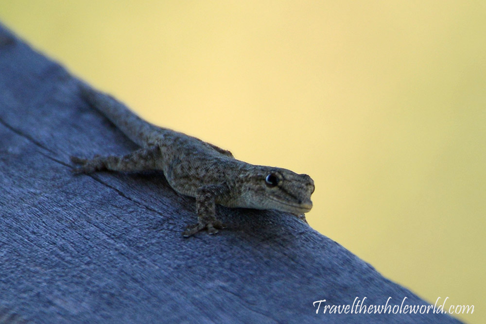 Of course when I hiked I was the only one around, and not a soul was seen in all directions. I had this entire place to myself. I assume since the wildlife was so skittish they aren’t exactly used to visitors yet, which was why it was so hard to spot anything. I was a bit surprised to find a bird watching tower erected by the lake. As I hiked to it I came across this colorful lizard above, and this smaller lizard below that was up on one of the rails.