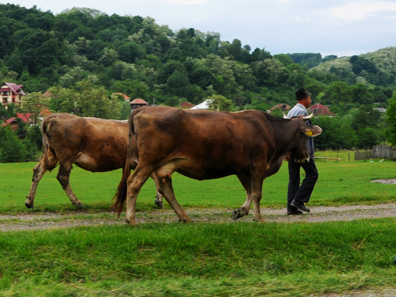 I got the feeling that a lot of Romania’s villages haven’t changed too much in the past few hundreds years. Of course a lot of modern technology has been introduced, but horses and carriages seem to be more popular than cars the farther you get away from cities, and I’ve seen many farmers doing work by hand using axes and reaps instead of machinery. Above are some chickens that were wondering outside of a farm’s fences, below a man leads several large bulls down a street and on the lower right some people get a lift from two horses. I saw dozens of horses being used for transportation of people and goods such as hay or lumber from freshly cut trees.