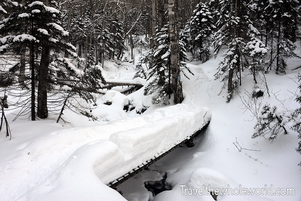 On the beginning of the trail we crossed a few small bridges over frozen creeks. Above are two of my friends who I did the hike with. I have to fly to experience things like this, but luckily for them they live only a few hours away in New York! We might get a blizzard here and there in Virginia but can easily hit a year without any snow. Even when we do get significant amounts it usually doesn’t last long! In Vermont there is always deep snow in the forest throughout the winter. Luckily for us most of it along the trail was already packed tight. In the photo below you can get an idea of how deep the snow was off trail.