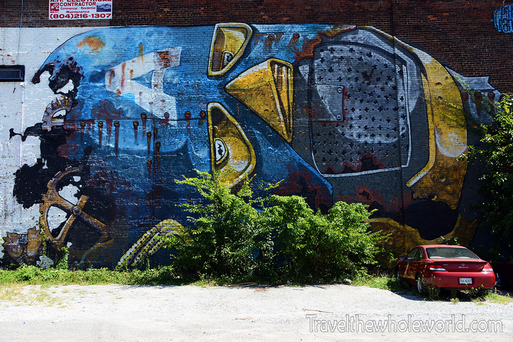 Richmond seems to have more graffiti or street art on its buildings than any other city I’ve been to. Usually I see random buildings covered here and there, but it seems common throughout the city. These two photos above and below were from the Shockoe Bottom area. Main street, Monroe Ward, and other neighborhoods all had them as well.